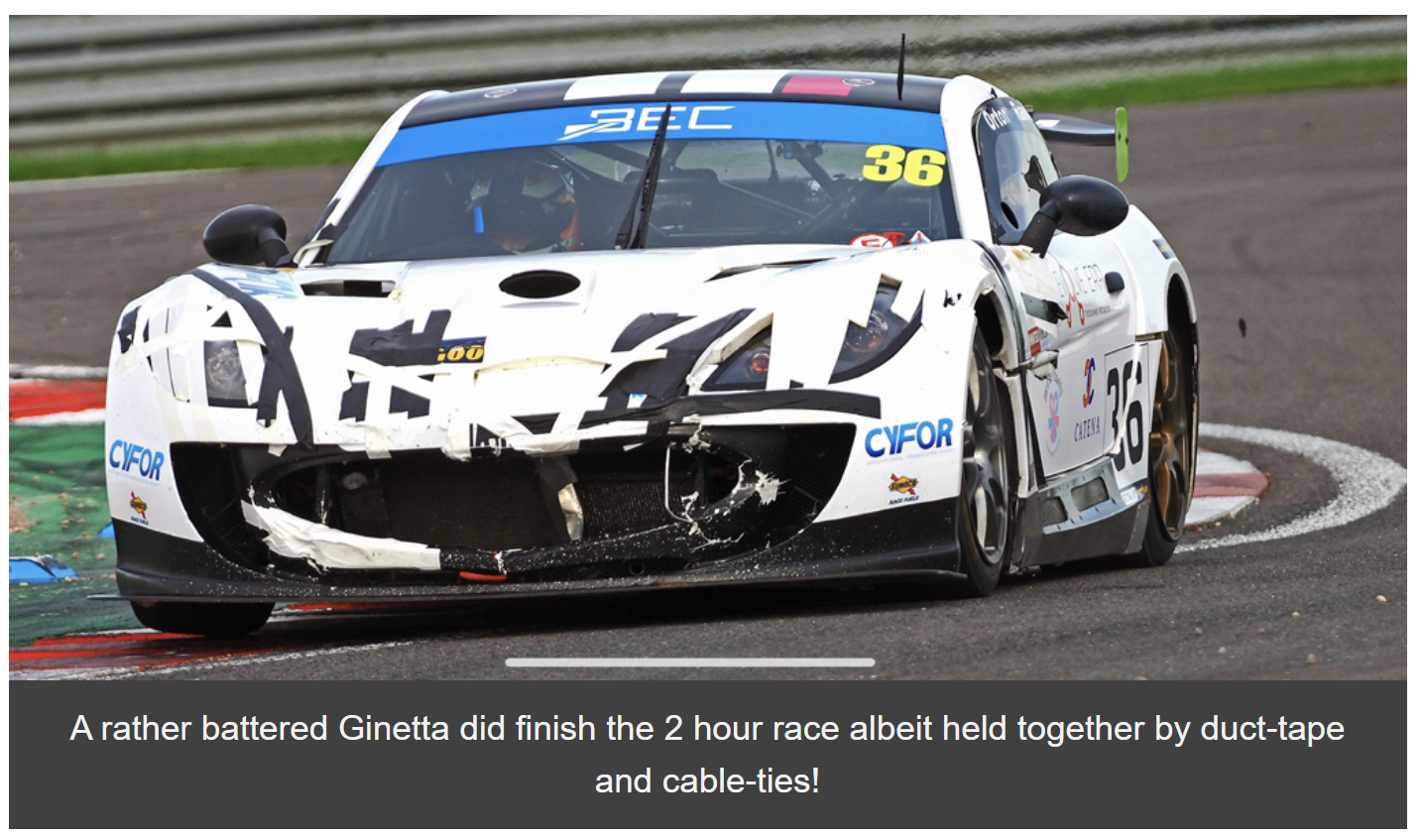 Despite losing the bonnet of the car at the site of the accident, the team retrieved it and refitted it to the car – in a fashion.